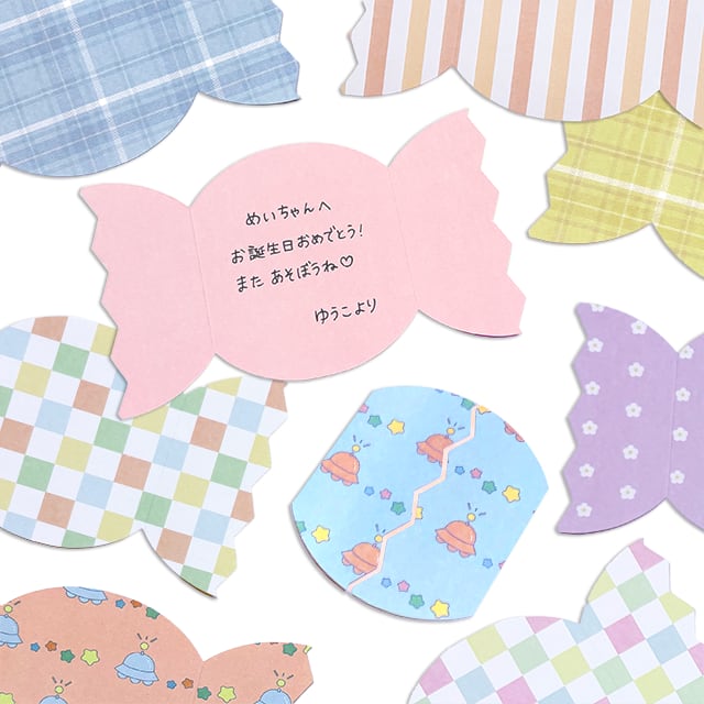 ころんとしたフォルムが可愛い、キャンディ型のメッセージカードです。